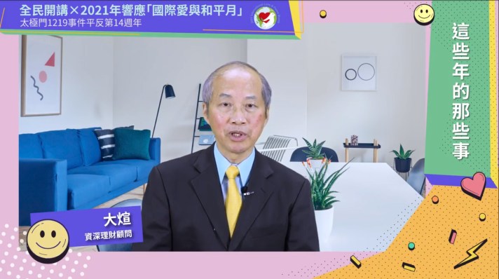 (記者彭明/台北報導)國家人權會成立滿周年,這一年來卻鮮少與人民溝通對話,對於台灣重大人權侵害案件沒有積極作為,令人民深感失望。平反1219行動聯盟主辦「2021年響應『國際愛與和平月』全民開講」系列,於9月22日晚上以主題「這些年的那些事」線上論壇https://youtu.be/eX7l0CmOAtA,邀請四位親身參與平反太極門案件的受害者,分享25年來因少數不肖公務員濫用公權力,傷害人民、破壞國家體制的心痛故事,知名財經講師大煊即以著名歷史故事比喻,太極門案是「莫須有」的事件,更是國家領導人不能迴避的責任。