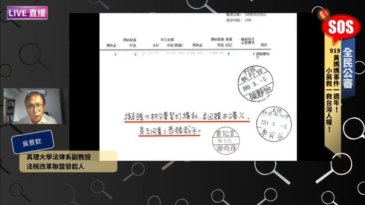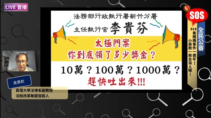 法稅改革聯盟發起人之一,真理大學法律系副教授吳景欽於919事件後幾天,舉著與黃媽媽一樣的牌子在警政署前嗆聲,該牌內容質疑主任執行官李貴芬在太極門案件中領了多少獎金?吳景欽表示,領有執行獎金是文書上白紙黑字的證據,不是人民偽造的,而且誹謗罪屬於告訴乃論,但警察卻依一通電話就進行盤查且隨機逮捕。有關執行一節,吳景欽指出,2000年以前,執行業務屬於法院,2000年才於法務部下成立行政執行署專責處理。但執行過程免不了有爭議,吳景欽覺得仍應回歸法院處理才合理。且行政機關負責執行,很大的誘因就是績效獎金,行政執行署的獎金來源除了稅務還有罰鍰,不管任何名目,政府機關的獎金都是萬惡的淵藪。