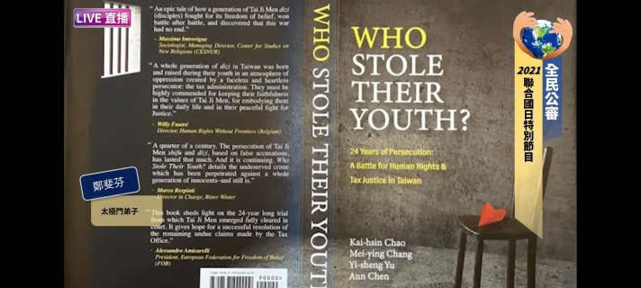 太極門弟子Fabienne Jen分享二本記錄太極門師徒25年來堅持真理,爭取信仰自由的英文版新書,第一本是《誰偷走了他們的青春(Who Stole Their Youth)》,從封面、封底背景為陰暗的牢房/偵訊室,象徵太極門師徒長期受到的不公不義待遇及迫害。紅色紙飛機代表警戒、求助、對自由的渴望。而封底高牆窗口注入一線曙光與希望。第二本是《寒冬雜誌選集:台灣的太極門案件–邁向人權與宗教信仰自由之路(Bitter Winter Anthology)》,從太極門修行道場之一瑞士山莊的殘破景象道出25年被政府的迫害景象,但在晦暗中有著在西方是為慶典的紅色玫瑰花瓣,代表太極門師徒心中總有愛與希望,早日平反案件,並願世人透過二本書了解太極門案,進而正視法稅人權的重要性。