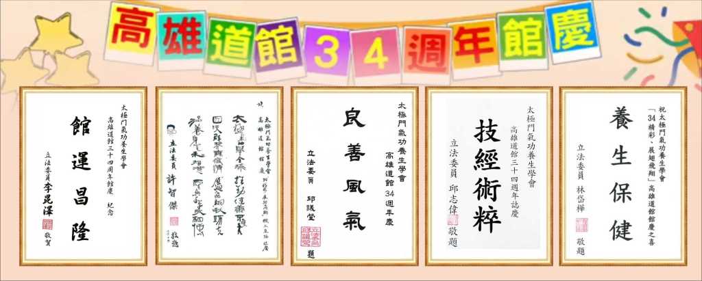 圖二:太極門高雄道館34週年館慶,來自中央及地方首長、6位立委、42位縣市議員、12位媒體界好友與各界嘉賓等,以錄影、致贈墨寶、來函或海報祝賀太極門高雄道館生日快樂。