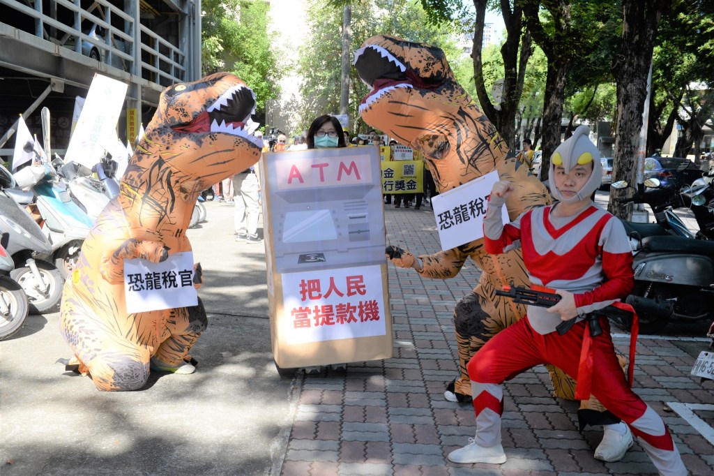 台灣稅災案件層出不窮,更有許多企業被請到國稅局喝咖啡,協商多少繳一點,稅務獎勵金誘使稅官將人民當成提款機?人民苦不堪言!法稅改革聯盟、平反1219行動聯盟等多個民間團體今(6)日以行動劇諷刺恐龍稅官貪圖獎金,將人民當成提款機。