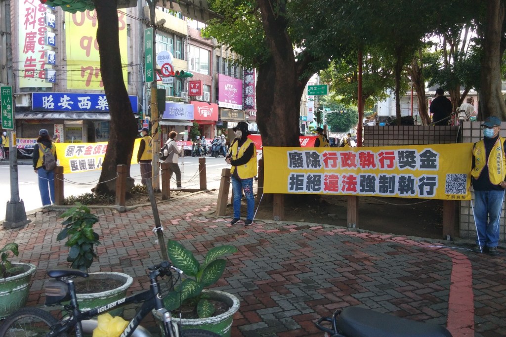 圖2:志工們在火車站前各個路口拉著布條,進行法稅宣導。
