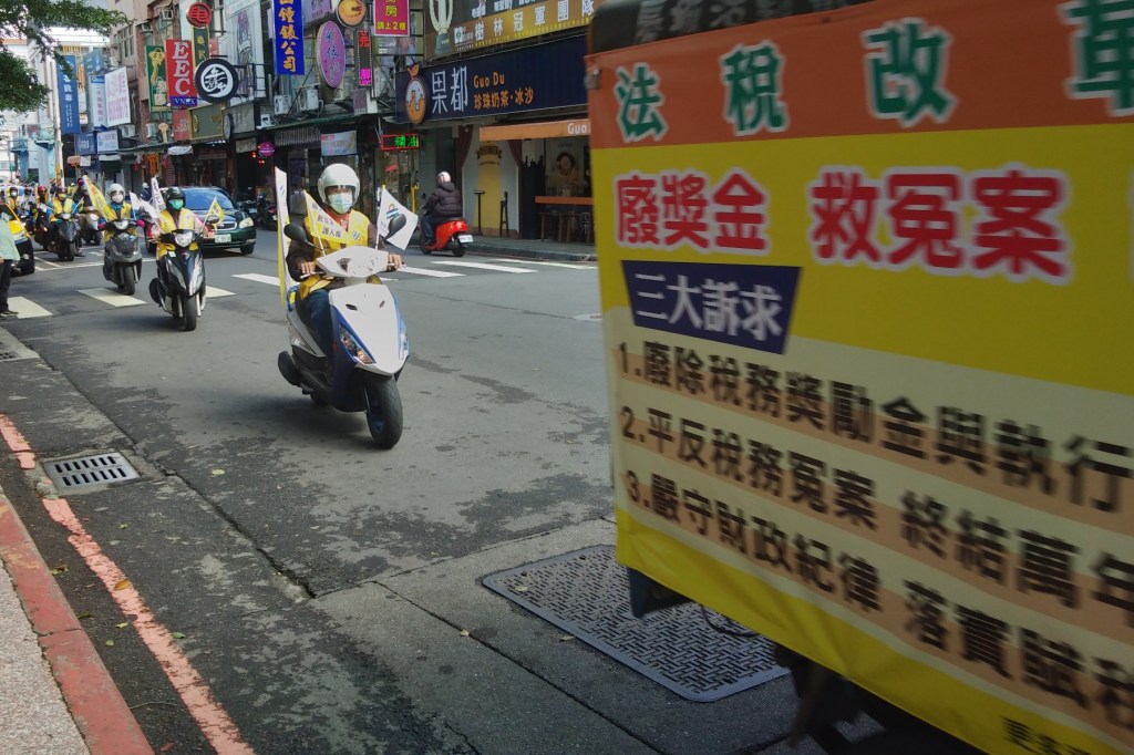志工鳳姐邀請街訪鄰居及過往旅客一起支持法稅改革的三大訴求:「廢獎金」、「救冤案」、「護人權」。鳳姐提到,國稅局每年編列1.3億稅務獎勵金,執行署編1.9億執行獎勵金,從延宕25年的太極門冤稅假案就可看出,獎勵金誘使稅務與執行人員,罔顧法院判決,執意違法拍賣民產。她表示,相信絕大部分的公僕都是秉持良心做事,但,面對少數心術不正的官員違法,政府絕對不能睜一眼閉一眼,讓不良的官員壞了這塊美麗的土地,毀了福爾摩沙的美譽。