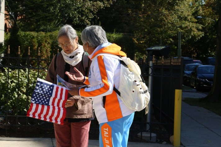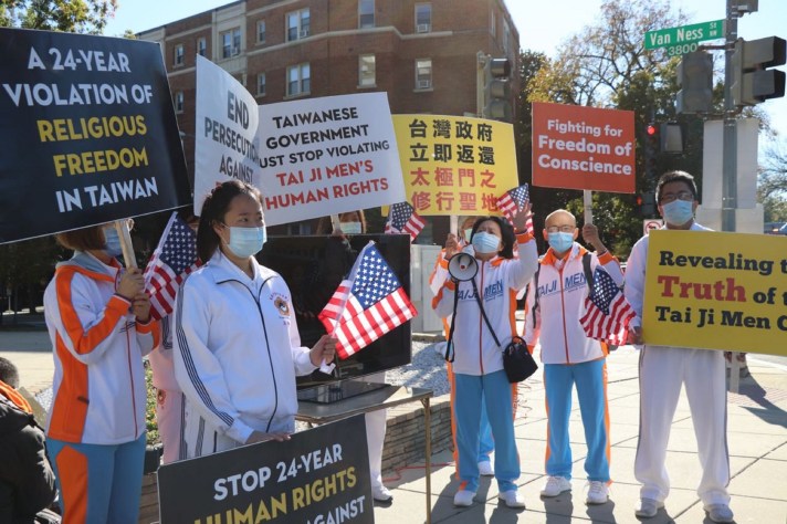 【記者谷悅禾/報導】「我們愛台灣!」「蕭大使,下來面對!」「為正義而戰!為人權而戰!」「歸還我們的修行聖地!」11月5日,一群來自全美各地的太極門弟子代表在位於華府的駐美台北經濟文化代表處前抗議,怒拍桌子,這是他們為了太極門冤錯假案,今(2021)年第三次向蕭美琴陳情請願,在此之前他們寫過很多信,也打過很多次電話,希望能和蕭美琴見面請願,但都無法見到面。他們要求台灣駐美代表會見太極門弟子代表,並把太極門弟子的心聲傳回給蔡總統,要求台灣政府立即解決太極門案。經過的路人及車輛,紛紛豎起大拇指或按喇叭表達支持。