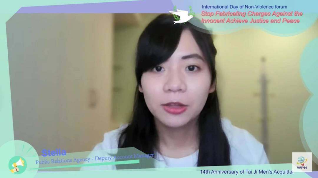 Stella非常痛心,太極門這樣一個促進世人身心靈健康的團體,竟然會被無良的檢察官誣陷為欠稅的邪惡團體。她指出,太極門掌門人洪道子博士一生致力於推動愛與和平、促進全球的融合,在2010年時成為亞洲獲得「聖雄甘地獎」的第一人。她在太極門練氣養身除了擁有健康的身體外,學到更多的是修改脾氣和心性的心法。在工作上遇到刁鑽的客戶,不是沉浸在焦躁的情緒裡,而是去看到事情正向的那面,並帶領團隊一起轉念,給出最好的解決方案。Stella驕傲地表示,她的師父洪道子博士一輩子都在推廣良心善行,即使被國家不法官員誣陷長達25年,但師父依然繼續帶領弟子走遍全球101個國家推廣愛與和平。2019年Stella也跟著洪道子博士前往印度參與全球首席大法官會議,和來自世界各國的元首領袖交流良心的意義,他們承諾會把良心的理念帶回自己的國家、並在自身的崗位和生活中貫徹落實;太極門師徒也走進印度的校園,與學生、教師強調良心教育的重要性,讓良心行事的觀念可以從小扎根,以發揮自身的潛力。