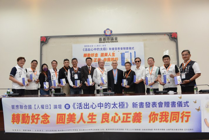 【記者廖苡喬/嘉義市報導】12月人權月開跑,由嘉義市議會指導,臺灣財經刑法研究學會、WPN世界民報等9個民間團體於嘉義市議會舉辦「轉動好念 圓美人生 良心正義 你我同行」《活出心中的太極》新書發表暨響應聯合國人權日法稅論壇。莊豐安議長致詞時表示,肯定太極門在公益與良心所做的努力。出席來賓均呼籲全國各界人士從良心出發,攜手打造健全的賦稅人權環境,讓後代安心永續發展。