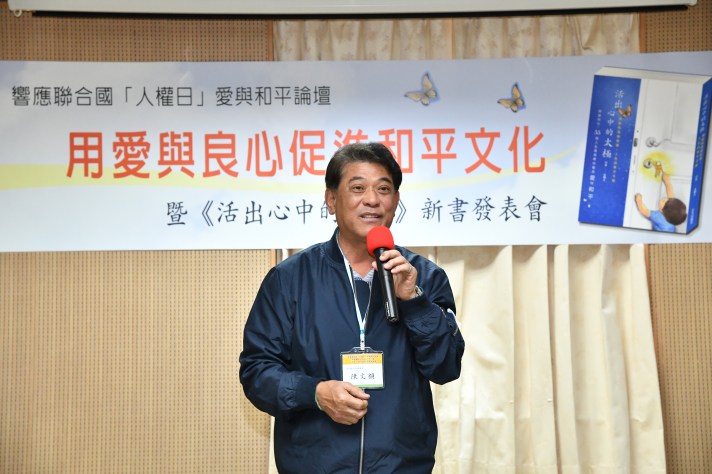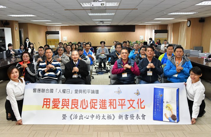 響應12月聯合國人權月,聯合國/NGO世界公民總會、臺灣財經刑法研究學會等九個單位,12月13日於金門縣議會舉辦《活出心中的太極》新書發表會暨「用愛與良心促進和平文化」論壇。邀請金門縣議會議長、議員、鎮長及里長等各級民代及專家學者,一起轉動世局,呼籲政府落實「國際人權兩公約」,保障人民與生俱有天賦人權,任何人或公權力都不應侵犯或者剝奪他人的基本人權,應該尊重、保護並共同捍衛。