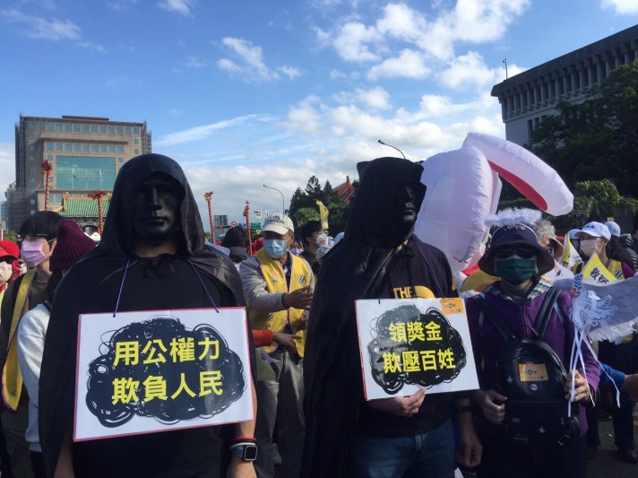 來自桃園參與遊行的鄉親,裝扮成黑衣人與兔子,黑衣人是國稅局及行政執行署的貪官,用公權力欺負人民,為領獎金欺壓百姓;兔子則是象徵這些貪官應該吐出獎金、還財於民。陳小姐表示,太極門稅務假案,25年來政府一直沒有解決,只要沒有解決,就會堅持到底,堅持敦促政府法稅改革的決心。她呼籲政府一定要傾聽民意,解決冤案、平反冤案,還給太極門一個公道,任何一個稅災戶都不應該被國家迫害。