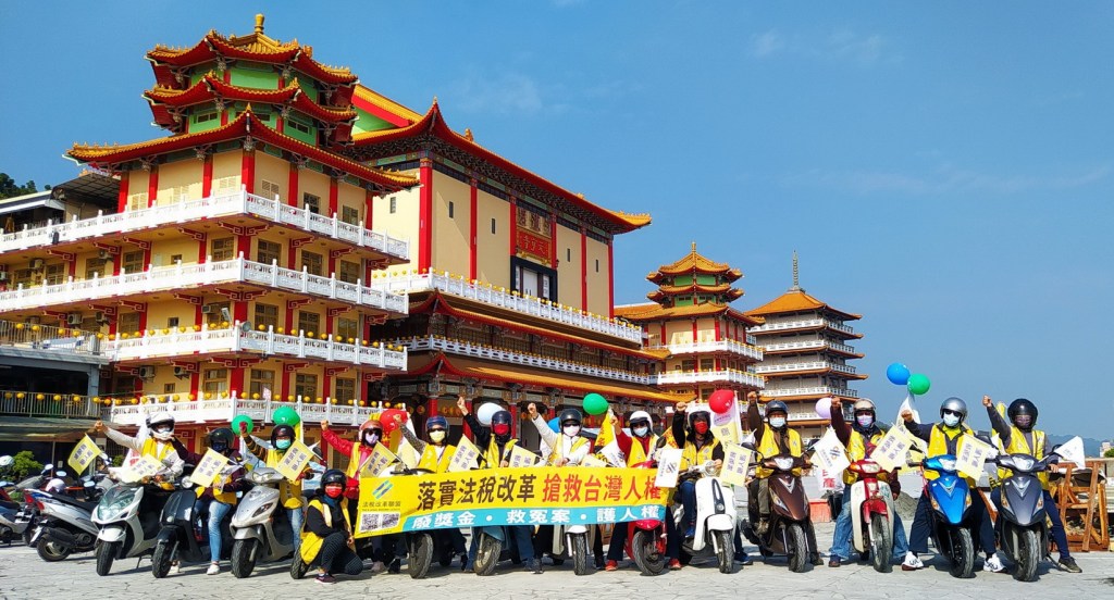 圖二:法稅改革聯盟志工以機車連在元亨寺前合影,祈願台灣落實法稅改革,搶救台灣人權。