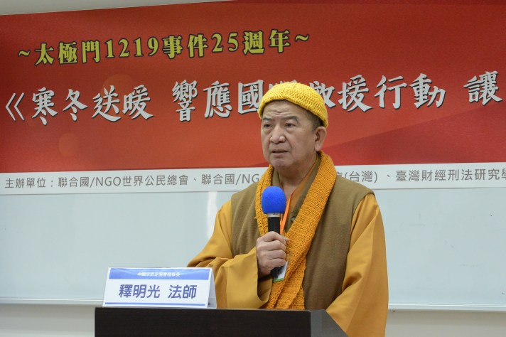 明光法師曾經參與多次國際論壇,也為太極門遭受國家宗教信仰迫害而站上凱到聲援。明光法師提到,這次參加在新北市議會的記者會,更加地深刻與真實,因為看到了國際友人正式地提出這樣一個報告書並送交聯合國人權理事會。他說:「希望我們當今的總統──蔡總統應該正視這個事情,這個已經連續25年的事件。」