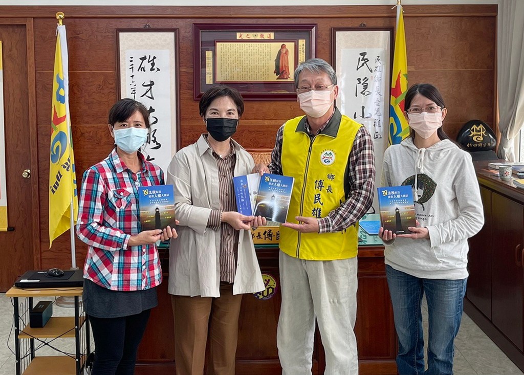圖一:法稅改革聯盟志工拜會屏東縣竹田鄉鄉長傅民雄(右二),並致贈《活出心中的太極》及《反法稅奴役搶救人權大團結》二本書,分享古老的東方養生心理學,以及愛與和平的理念。