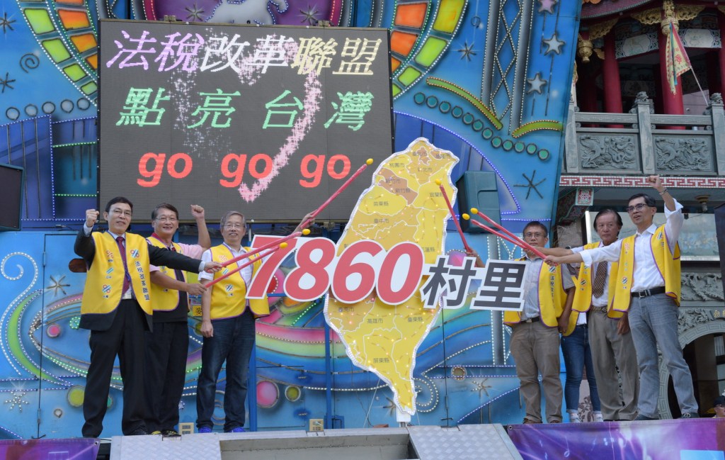 圖二:2018年9月2日,十多個民間團體在高雄市廣濟宮廣場舉辦「YOUNG POWER 法稅改革 點亮台灣」活動,傅民雄鄉長(左中)點亮象徵正義光明的稅改希望聖火,象徵帶給全臺灣祝福與希望。