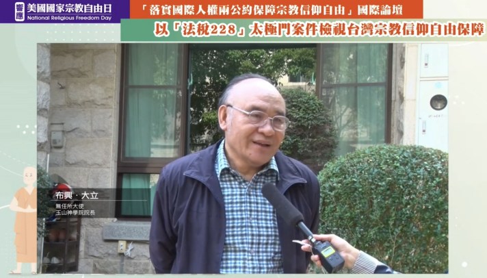 無任所大使暨玉山神學院院長布興.大立表示,美國自1786年的宗教自由設立至今已經有236年的時間,以宗教的力量來做為建立一個國家最基本的力量,所以美國的憲法尊重人權跟自由,宗教的力量、自由的力量和人權的力量讓美國成為世界的大國。他認為,政府不能忘記宗教的力量,要成為整個世界的普世價值。針對最高法院已經判決無罪、無欠稅的太極門案件,已經25年了,違法課稅卻還未終結,布興.大立認為無論是司法單位或是財務國稅局都要以最高法院的公正判決為依據,否則就是越過人權自由的一個底線,他鼓勵太極門人不可以軟弱與放棄,要繼續爭取,不少的朋友和宗教自由的國家都會成為後盾。他呼籲,這是最後一道防線,大家一起努力,幫助台灣政府,站在正向的力量跟正義的力量。