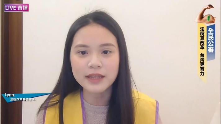 法稅改革聯盟志工Lynn則說明從2016年開始法盟的行腳,除了平日站在街頭的宣導、每年的1219站上凱道訴求之外,2016年的12月18日夜宿凱道,那夜天氣非常的濕冷,睡醒時帳篷下面都是濕的,但也顯示他們堅持法稅改革的決心。第二天在凱道上立了「光之塔」,希望政府能夠銘記賦稅人權及人權紀念日。2017年推動超徵還民連署,7,760位村里長響應,連署率高達96%。2018年除了提倡廢獎金、護人權及超徵還民的連署之外,11月4日,在華山舉辦一場讓孩子留在臺灣的稅改大遊行及倡議活動。同年,青年志工也發動聖火環島,繞行臺灣一整圈。2019年隨媽祖祈福遶境,當時也造成轟動。2020年發生基隆巿民陳青旭案,透過法盟的聲援及監察院的調查得到了成果。可惜7月、8月聲援太極門案,太極門的修行道場預定地還是遭到政府的違法拍賣,令人非常難過。