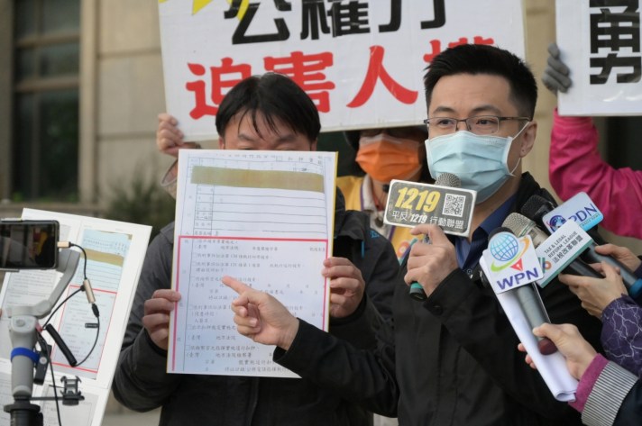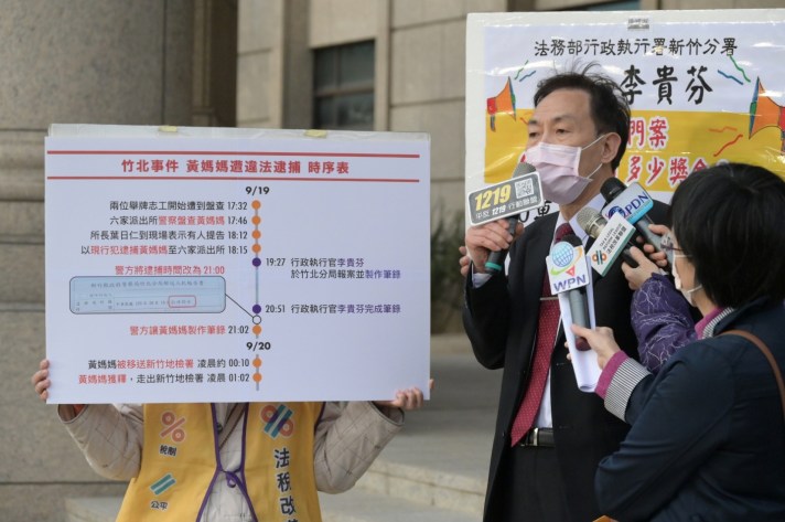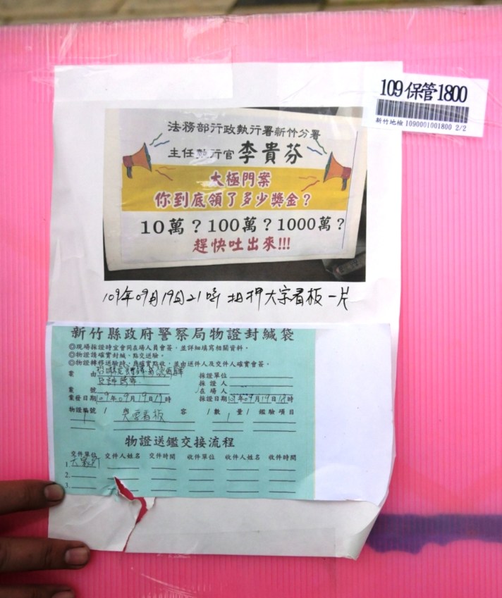 【記者陳育儒綜合報導】曾經引起專家學者及民意代表抨擊,被視為侵害人民集會自由的919竹北事件,全案至今告一段落,黃姓志工媽媽去(2021)年獲不起訴處分,主要爭議的「牌子」-「主任執行官李貴芬 太極門案你領了多少獎金?」,也在今日(1月20日)被法稅改革聯盟志工領回。作為公權力侵害人權的見證者,平反1219行動聯盟、法稅改革聯盟志工在地檢署前面舉辦一場「追蹤真相:919竹北事件與台灣法稅之亂象」的直播活動,輔仁大學企管系兼任助理教授魏賜聰及直播主_炯炯有神_睛也到場聲援,為大家發掘更多的法稅黑手內幕。