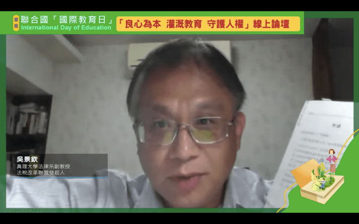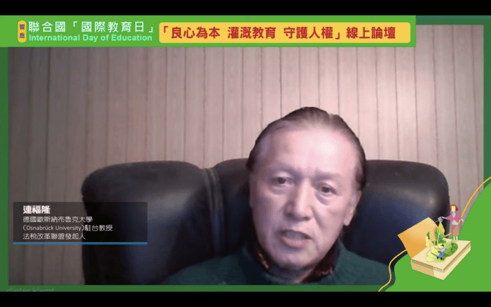 (記者李天生/台北報導)近年國際疫情與天災不斷,台灣的法稅人禍更是日益加劇,侵害人權,人民該如何團結合作,共度難關?教育就是非常根本的關鍵力量。1月24日是國際教育日,聯合國/NGO世界公民總會與國內16個民間團體共同舉辦線上「良心為本 灌溉教育 守護人權」論壇,邀請法學、宗教、教育界等專家與社會菁英與談,以太極門案遭遇的法稅迫害為例探討,吳景欽教授表示,人民遇到公權力違法時,可以善良但絕對不能沉默,要勇於對抗。