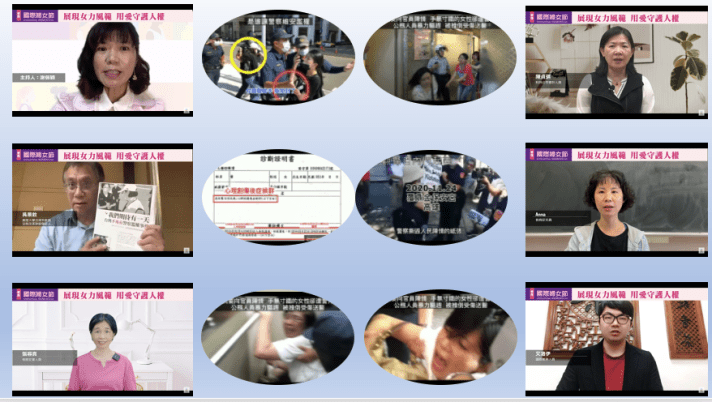 主辦單位播放多起女性在手無寸鐵且未犯罪的情況下,被公權力暴力對待的影片。真理大學法律系教授/法稅改革聯盟發起人吳景欽表示,女性在職場的表現有目共睹,但依據犯罪統計顯示,女性被害者的比例遠遠高過男性。吳景欽認為,女性因為生理構造的關係,容易成為被施暴的對象,因此他呼籲政府應該帶頭保障女性的人權。他以919竹北事件及中壢詹姓女老師被員警大外割,對比松山分局被10位黑衣人砸電腦卻與對方和解為例,顯示台灣的執法並不公正。他呼籲政府應該帶頭做起,保障婦女的人權,不要讓婦女因為公權力或戰爭感到恐懼。