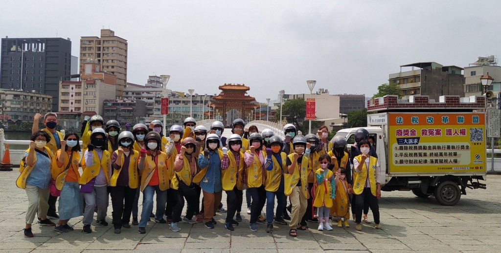 圖二:法稅改革聯盟志工聚集覆鼎金保安宮前合影,呼籲落實法稅真改革,提升賦稅人權,祈願天佑台灣,實踐幸福國度。