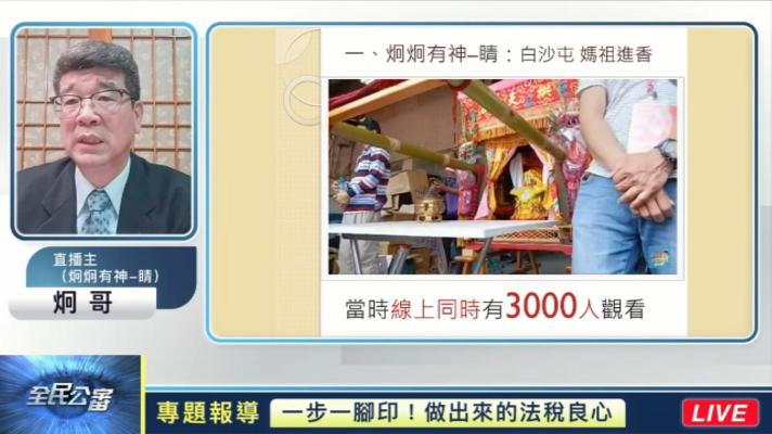 「炯炯有神-睛」直播主炯哥表示,他看到太多社會上不公不義的現象與事實,會發掘真相,也認為每一個人都要為自己的言行舉止負責,他才挺身而出做直播主,目的就是希望把真相用鏡頭分享給更多的民眾知曉。他分享去年線上同時有三千多人觀看的白沙屯媽祖進香的相片並分享其中意義,第一、與白沙屯媽祖的距離只有1.5公尺,顯示媽祖的親民,他也期許臺灣的政府官員也能做到貼近民意,聽聽人民的聲音。第二是白沙屯媽祖遶境沒有固定路線,而是由媽祖決定,炯哥覺得這是簡單快速有效的智慧,可以親近人民,解決人民的痛苦,也是他做直播主對自己的期許,依上天給予的良心去濟世助人、懲奸除惡。另一張相片則是香燈腳送他的結緣品──筆,炯哥表示,一支筆可以寫好文章及學說話,對於能夠幫助世人的事情,應勇敢地說出來寫出來。