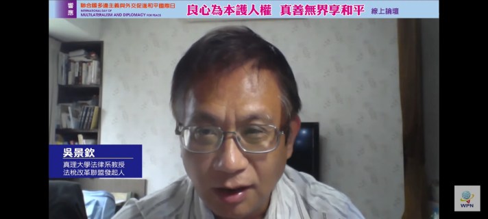 真理大學法律系副教授暨法稅改革聯盟發起人吳景欽4月24日參加由聯合國/NGO世界公民總會、法稅改革聯盟等多個民間組織共同主辦的「多邊主義與外交促進和平國際日」線上論壇,指出辦案瑕疵族繁不及備載的侯寬仁檢察官,一路犯錯卻一路升官,是對人權立國最大的諷刺。