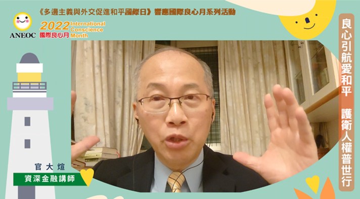 【記者王文一/台北報導】4月24日是聯合國「多邊主義與外交促進和平國際日」,其主要意義是國際上的事由大家共同商量協辦,故多邊主義有助於國家化解國與國之間的矛盾和分歧,從根本上解決彼此間的困境,創造更和平穩定的世界。為響應此深具意義的日子,聯合國/NGO世界公民總會、太極門氣功養生學會等民團共同舉辦「良心引航愛和平 護衛人權普世行」線上論壇,資深金融講師官大煊以主題「槍下一公尺,見菩薩、見良心」分享從良心省思,呼籲國稅官員勇敢向前一公尺,解決所有稅災戶的困境,將是帶給「國際良心日」最好的禮物。