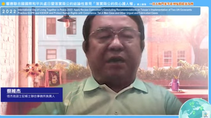 【記者范光惠/台北報導】第三次兩公約國家報告國際審查會議於5月13日落幕,國際人權專家提出92點結論性意見。聯合國/NGO世界公民總會等21個民團於5月15日舉辦響應聯合國國際和平共處日「落實兩公約良心護人權」線上論壇,希望督促政府徹底落實兩公約。信杰地政士記帳士聯合事務所負責人蔡維杰表示,5月13日在法務部前面,人民和平表達心聲希望讓國際人權審查專家聽到民間真正的聲音,但在現場遇到的第一個震撼狀況,有將近20位警察,一開始就馬上舉牌警告活動是違法的,場景彷彿回到過去戒嚴時期的狀況。當時人在現場的蔡維杰提到,是否因為政府作為不符合國際人權,所以在九位國際人權專家前,絕對不能讓他們看到真正的真相,因此必須用最威嚇的力量,讓人民的聲音出不來。