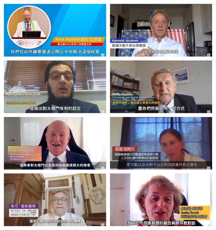 多位來自國際的專家以影片與談。聯合國/NGO世界公民總會主席Rene Wadlow表示,與聯合國密切合作的非政府組織顧問們,非常關切太極門氣功養生學會的案件,即便台灣不是聯合國成員。太極門案件有兩個面向:其一、捍衛宗教和心靈自由;其二、公平透明的稅制程序。太極門多年來致力於與其他國家文化交流,許多人因此而認識了台灣豐富的文化遺產,太極門案件在台灣的媒體、國會、法庭和公聽會上一直廣受討論,這個案件的問題非常明顯,我們在此呼籲要儘速公開公平地解決這個稅案。