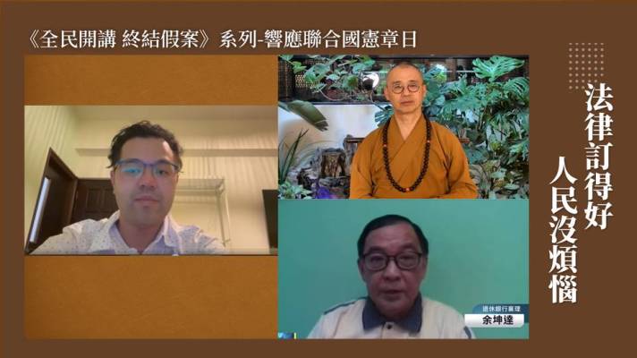 【記者黃秋心/台南報導】《聯合國憲章》在1945年6月26日由50個國家共同簽署,希望維持國際和平及安全,「全民開講 終結假案系列」響應聯合國憲章日舉辦「法律訂得好,人民沒煩惱」線上論壇,特別邀請釋法藏法師分享保障宗教人權對於國際和平的重要性,同時也邀請人權受迫害者坤達先生現身說法,呼籲政府即刻停止迫害人民,立即終結假案、平反假案,真正重視人民的信仰自由與人權。