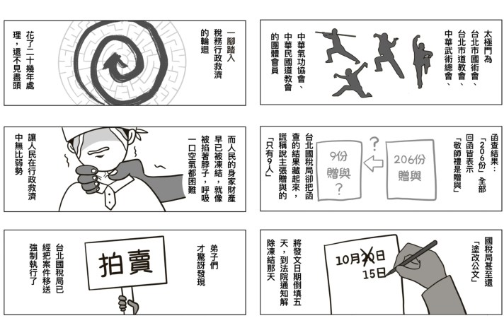 太極門是中華武術總會等武術團體會員,相同性質的團體「從未」因收受弟子贈與敬師禮而遭國稅局課稅,財政部函釋:「教會傳道人接受信徒之贈與免納所得稅。」教育部更三度證明「太極門不是補習班」,弟子贈與師父的敬師禮是傳統禮俗中的贈與,依所得稅法第4條規定屬免稅所得,國稅局卻一再開出錯誤稅單,導致太極門稅務案件在復查、訴願、訴訟之中不斷輪迴,至今20幾年仍然不見盡頭。