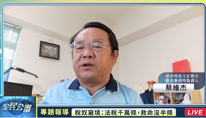 【記者潘真伈/台北報導】《納稅者權利保護法》自2017年12月28日施行至今,法稅制度仍有諸多不合理之處,時有所聞侵害賦稅人權,造成稅災遍野,人民有冤無處申的困境。7月17日《WPN全民公審》「稅奴窘境:法稅千萬條,救命沒半條」邀請信杰地政士記帳士聯合事務所負責人蔡維杰分享,就其多年與政府機關接觸的實例作解析,並以太極門案揭露行政官員的心態,期盼所有政府官員依法行政,公開透明,以良心為本,稅務人員應以善意的角度課稅,確保納稅人權利。