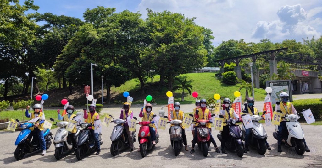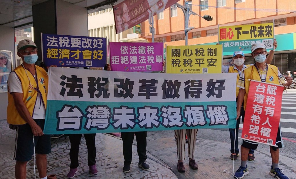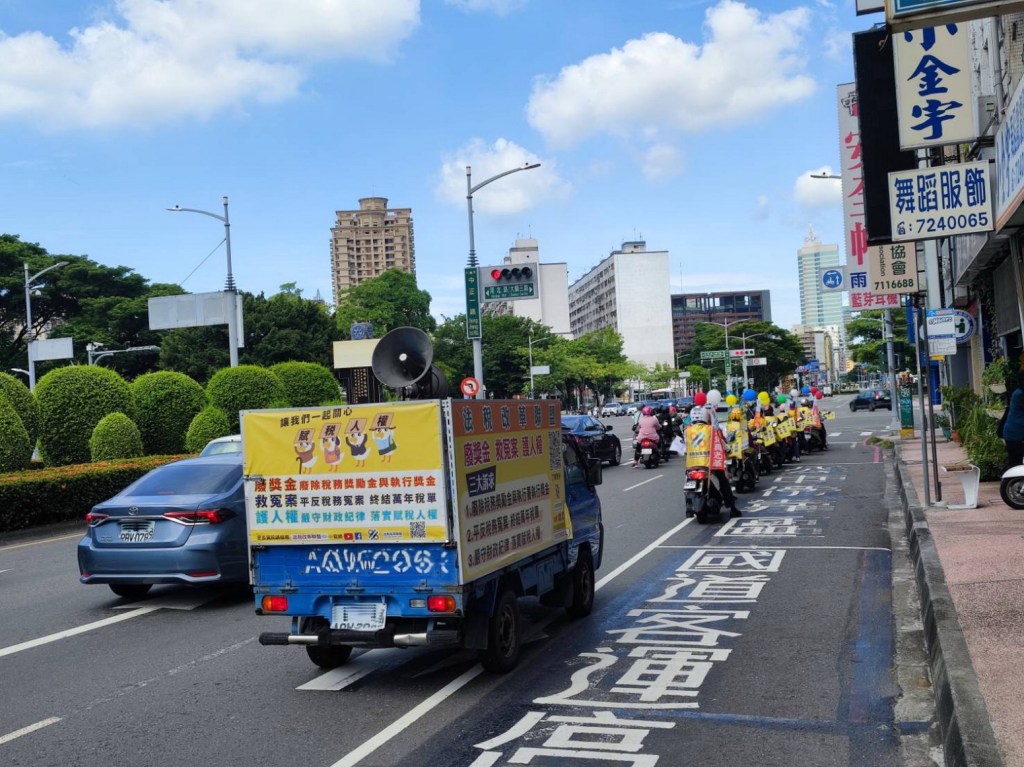 圖一:8月28日民團以宣傳車、機車連、舉牌和拉布條等方式,在各個重要道路倡議正確的法稅知識並推動法稅人權改革。