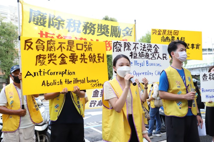 鍾小姐表示,檢舉獎金是更嚴重的貪腐!戒嚴時期檢舉匪諜抓到都是大地主,近期財政部稅捐稽徵法增列49條之一,將罰鍰的2成給檢舉人,最高額新臺幣四百八十萬元,是多大誘惑!俗諺:「挑糞的人不會偷吃糞。」但籃子裡如果放著黃金、鈔票肯定會被偷,她指出,稅賦查核人員要發現公司行號有逃漏稅情事太容易了,只要洩漏給自己信任的朋友同學,避免與法條相符親等關係,查稅核定前寫一封檢舉信函到國稅局,事後補稅處罰繳清,屆時領取檢舉獎金太容易了!檢舉獎金只有禁止而無課責或科罰機制,絕對無法阻絕內部稅賦查核人員冒領檢舉獎金,釜底抽薪的做法是根本就不要有檢舉制度,然而政府不會寫在國家報告裡,她希望審查委員能有管道知悉。法稅改革聯盟表示,國家一方面說反貪腐,一方面竟濫發獎金不透明,只做表面功夫,連最基本的公開透明都做不到,呼籲廢除不法獎金,拒絕迫害人民。法稅改革聯盟國際志工指出,獎金造成貪腐問題,檢舉獎金是變相鼓勵人性貪婪,沒有法源依據,不依事實、證據開出稅單是因獎金引起,讓人民飽受迫害之苦,監察院理應糾正不依法行政的政府,卻沒有發揮應有職責,例如太極門案中,監察院指出侯寬仁八大違法,移送法務部從嚴究責議處,但法務部半點懲處也沒有,反而高升廉政署副署長、法醫研究所所長,這是最大的貪腐!志工指出,良心才是解決問題的關鍵,台灣若要符合國際反貪腐標準,應遏止所有貪腐行為,並提出「反貪腐、廢獎金、護人權」三大訴求。