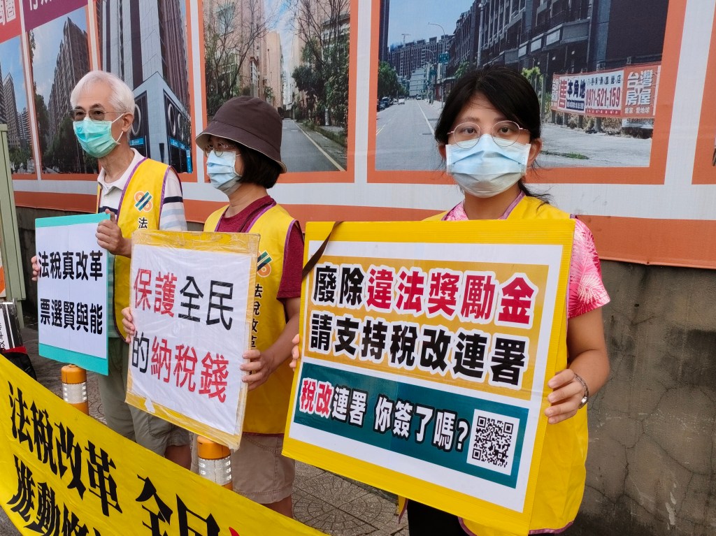 稅務獎勵金、執行績效獎金被質疑是貪腐的源頭,法稅改革聯盟倡議「廢獎金 救冤案 護人權 」,中秋連假法稅改革宣導不停歇,小朋友在家長的帶領下站在街頭參與公民運動。小朋友的手上拿著「搶救人權」、身上掛著「廢獎金 救冤案 護人權 」標語,期望喚醒台灣官員的良心,改革是台灣孩子們的希望。