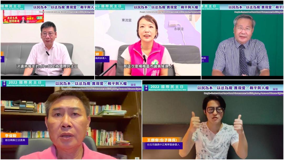 【記者張若渝台北報導】9月15日,聯合國NGO世界公民總會等近三十個團體單位,為響應2022年聯合國國際民主日,特舉辦了「以民為本、以法為規 實現愛、和平與人權」論壇,當日上午除於台灣大學應用力學館國際會議廳召開之外,下午場並以線上方式舉行,全日並同步進行直播。主辦單位表示,要讓知識的力量及全民的心聲,不受疫情的侷限。