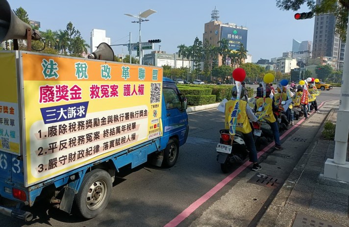 【記者李茗/高雄報導】檢舉獎金制度是白色恐怖戒嚴時期產物?法稅改革聯盟 及平反1219行動聯盟高屏地區志工13日以宣傳車、機車連、舉牌和拉布條等方式,在各個重要道路倡議正確的法稅知識並推動法稅人權改革,志工指出,源於白色恐怖戒嚴時期的檢舉獎金制度,等於天天考驗著稅務人員的良心,檢舉者、辦案人員、掌權者成為一個產業鏈,形同「處罰人民來集體分贓」。