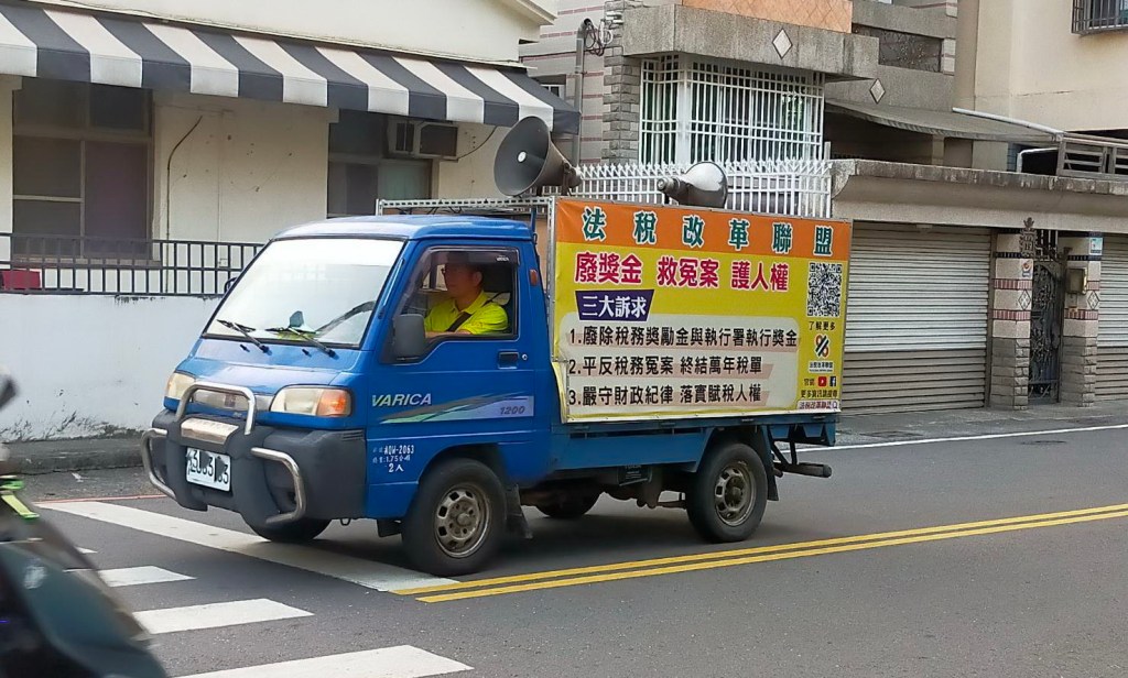 【記者李茗/高雄報導】法稅改革聯盟及平反1219行動聯盟高屏地區志工4日以宣傳車、機車連、舉牌和拉布條等方式,在各個重要道路倡議正確的法稅知識並推動法稅人權改革,志工指出,財政部超徵背後有多少是惡意徵稅,呼籲民眾監督政府,把關濫權徵稅的亂象。