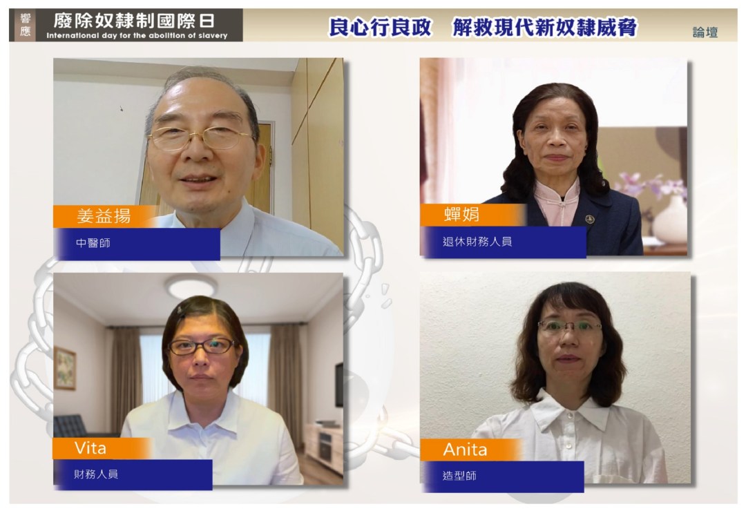 太極門掌門人暨聯合國NGO世界公民總會副主席洪道子博士致詞時表示,民主的基礎是自由與平等,國家有義務創造使人們享有經濟社會文化權利的環境,並實現人人享有公民及政治自由、無所恐懼且不虞匱乏的生活。身為制法者與執法者,須謹記人權保障的精神,在實務上謹慎而為;而身為世界公民,無論身處何位,也應為不公不義發聲,團結行動,發揮監督與互助的力量,終結現代奴隸制。