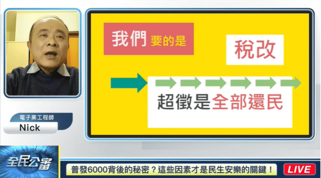 【記者陳瑄/報導】今(2023)年政府首次還財於民,發放現金6千元給每位民眾。4月9日WPN世界民報全民公審播出「普發6000背後的秘密?這些因素才是民生安樂的關鍵!」節目,電子業工程師Nick表示:「政府超徵還民,從法、從理、從情及人權的角度都講得通!」超徵絕不是政府的績效,而是預算編列出現嚴重失靈!尤其更要檢查財政稅制,當中隱藏了多少錯誤的稅單?隱藏了多少被戕害的賦稅人權?