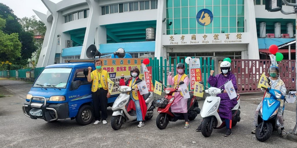 圖二:5月27日民團以宣傳車、機車連、舉牌和拉布條等方式,在各個重要道路倡議正確的法稅知識。