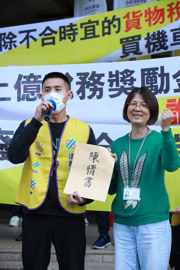 多位會計師趕來聲援,其中林光炫會計師指出貨物稅是源自民國35年定的奢侈稅,因為當時開汽車被認為很奢侈。但現在開汽車的是誰?為我們服務的小黃司機。騎機車的是誰?颳風下雨幫我們送外賣的,機車課17%的貨物稅,汽車要課25~30%的貨物稅,還要課營業稅。我們的稅制對這些很辛苦、低薪的人民是很不公平的。