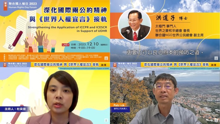 太極門掌門人暨聯合國NGO世界公民總會副主席、世界之愛和平總會會長洪道子博士致詞時表示,當《世界人權宣言》成為不斷擴大的人權保護體系的基礎時,通往和平的道路,仍舊充滿許多險峻的挑戰,人與人或是國與國之間,經常為了權力及名利而忘卻良心、違背真理。一念之善,形成蝴蝶效應,可造和平之境,而一念之惡,使戰亂一觸即發,也將讓世人墮入萬劫不復的苦難深淵。人心的善良力量來自「良心」,透過良心教育,為世界公民建立人權與和平的世界觀。良心,是人權與和平文化養成的重要根基,是一帖有效預防衝突並化解危機的良方。用良心促進愛與和平的文化,是預防之道,是平衡科技快速變遷時代的穩定力量,也是每一位世界公民每天都可以做的人權和平行動,更是永續聯合國人權日邁向百年的目標。生命的存在或毀滅,只在人的一念之間,當人們明白人權本天賦,良心本天生,世界本一家,人們便懂得尊重人權、團結合作,由心而生愛的能量,帶來共榮共好的世界;不僅以良心修復崩壞的社會,更要力行以良心為本的預防之道, 讓我們誠摯為世人祈福祝禱,願戰爭早日止息、世人良心覺醒,以禮相待 共同維護人權為世人造福,在邁向2030年永續發展目標的進程上,必須團結世界公民的善心並實踐善行,共同喚醒世人的良心、啟迪人們的智慧。