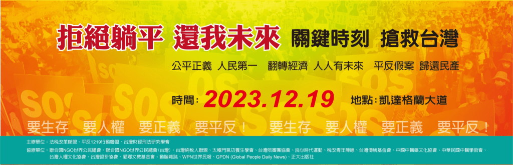 邀請台灣法學權威、史學家、白色恐怖政治受難者、資深稅務官員、法稅改革聯盟發起人、媒體、野百合學運領袖等專家學者,輪番站上凱道建言,搶救台灣未來,不能再等了。剖析台灣財政紀律日益敗壞,稅災淹腳目,救濟制度嚴重失靈。尤其,專家學者稱為法稅228的太極門冤假稅案,人權遭迫害長達27年,受害者高達上萬家庭,被稱為台灣法稅照妖鏡,成為國際人權學者高度關注與研究,因此在1219人權紀念日呼籲全民一起平反冤錯假案,讓台灣不再悲情,讓政府官僚們勇於改正錯誤,不再用法稅迫害人民,落實轉型正義,讓台灣邁向真正民主法治。