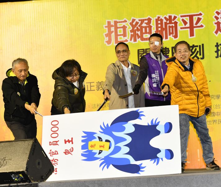 2023年12月19日法稅改革聯盟等民間團體在凱道發起街頭倡議,訴求「拒絕躺平,還我未來,關鍵時刻,搶救台灣」活動,大會以「全民抓鬼活動」四度高舉正義之劍,表明要斬除政府部門內的貪贓枉法者,包含財政部、國稅局、行政執行署與法務部裡的貪官汙吏,宣示拒絕濫稅、濫拍賣、枉法判決,要拿回百姓應有的基本生存權與公平正義人權。