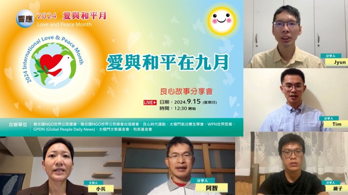 【記者粱一馨/台北報導】每年的9月15日是聯合國國際民主日,9月21日是國際和平日,現今世界戰爭頻傳,社會紛亂,人們企盼和平能早日降臨。為響應這兩個紀念日,聯合國NGO世界公民總會與台灣總會等數個民團共同合辦「愛與和平在九月」線上論壇(https://www.youtube.com/watch?v=Q5L22P3EjbY),邀請四位跨時代來賓,以各自不同經歷分享心目中的和平。