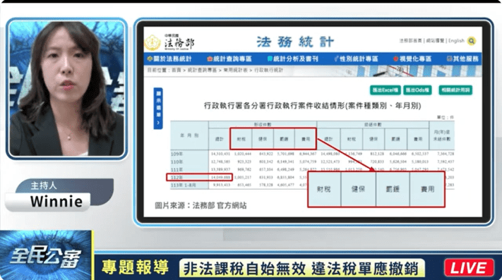 主持人Winnie首先提到,根據法務部統計資料顯示,行政執行案件類型分為:欠繳稅款、欠繳健保費、欠繳罰鍰和欠繳其他費用等4類。據統計,2023年一個年度行政執行案件新收件數高達1,404萬9,688件,以台灣人口2,342萬計算,等於10個人就有6個人被行政執行處分,這樣驚人的數字恐是人人自危!