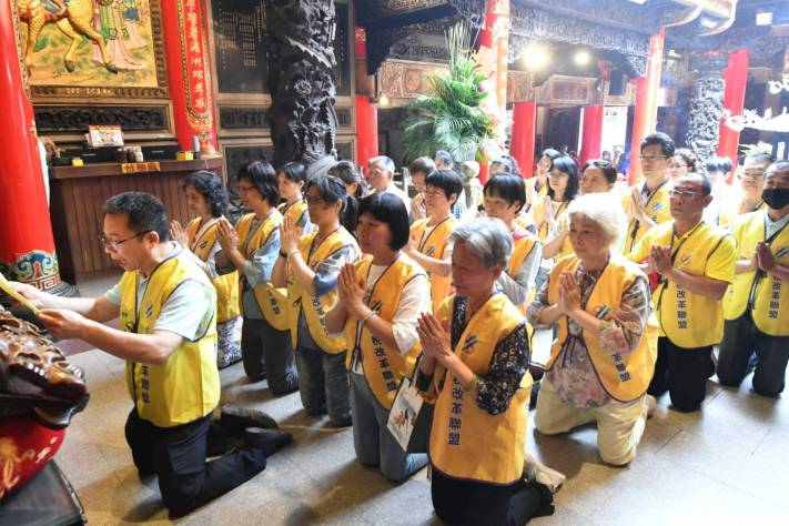 法稅改革聯盟志工身穿背心,齊聚媽祖殿前,由張姓志工上香並誦讀祝禱文,其餘參拜人員則雙手合掌,虔誠跪拜,誠心向媽祖娘娘稟告全台稅災戶的苦難與冤屈,祈願娘娘救苦救難、護佑台灣人民免於法稅災厄。