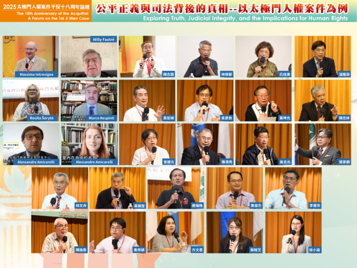 【記者古悅禾/台北報導】聯合國NGO世界公民總會、太極門氣功養生學會、臺灣財經刑法研究學會等近30個民團7月13日於臺灣大學應用力學館國際會議廳舉辦太極門人權案件平反十八周年論壇,主題「公平正義與司法背後的真相—以太極門人權案件為例」(上午場、下午場)。數位國際知名學者透過影片提供觀點,歐洲信仰自由協會(FOB)主席Alessandro Amicarelli提到,太極門案並非僅是一個亞洲美麗小島的地方議題,它具有普世意義—關於正義的脆弱、良心的堅韌、平凡人挑戰非凡錯誤的力量,它也提醒我們,宗教或信仰自由不僅只是一種信條,更關乎尊嚴、身分,以及無所畏懼地生活的權利,而我們都在此,就是為了確保這件事不能再拖延下去。